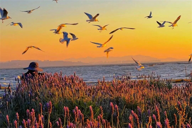 曳的风筝交织在一起,构成了一幅绝美的暮色图景。在这里踏青,享受的是 “落日飞车”般的浪漫。